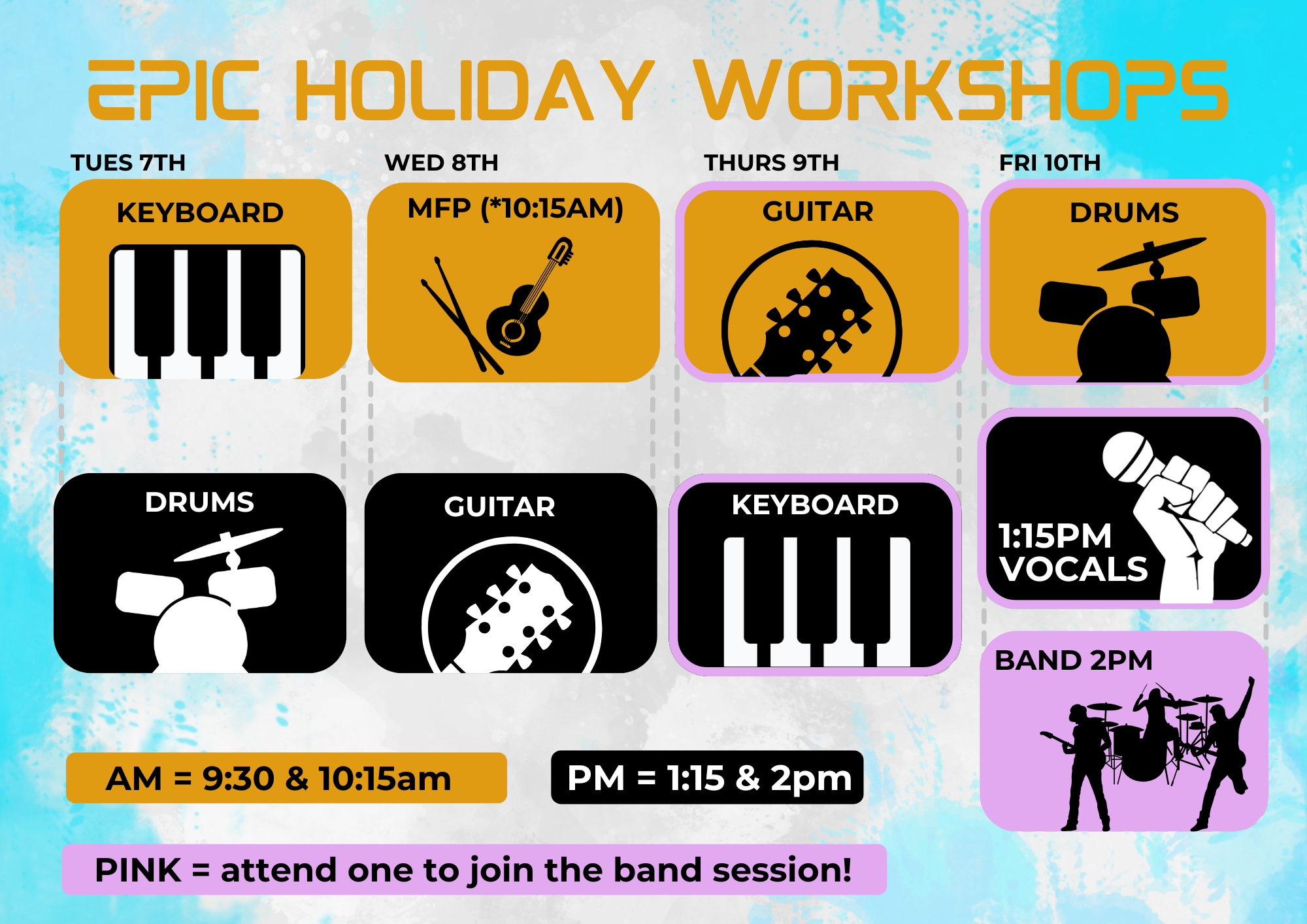These workshops are designed for Epic students aged between 7-12. We’ve got something for every level of student, whether they’ve been learning for 3 months or 3 years!