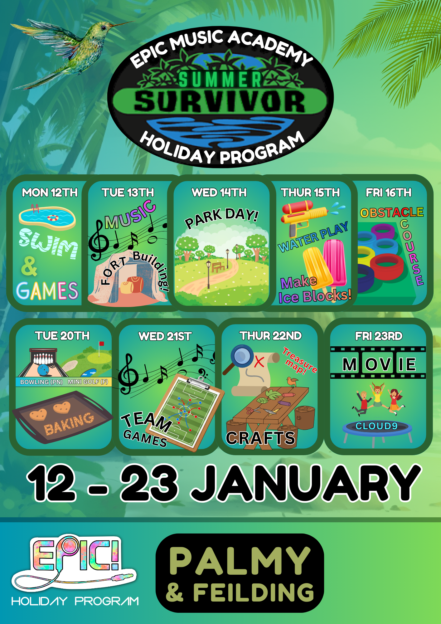 The Palmy EPIC Holiday Program is an OSCAR-approved, music-focused program led by our experienced EPIC MA team. Based in Palmerston North, we’ve been delivering creative, high-energy holiday experiences for over four years. Alongside music, kids can enjoy a wide variety of activities like crafts, games, baking, science experiments, and exciting trips out and about. Every day is designed to keep tamariki active, engaged, and having fun in a safe, supportive environment.